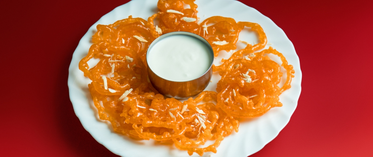 Fried (flour) in round shape dipped in sugar/honey syrup. Served with Indian yoghurt.