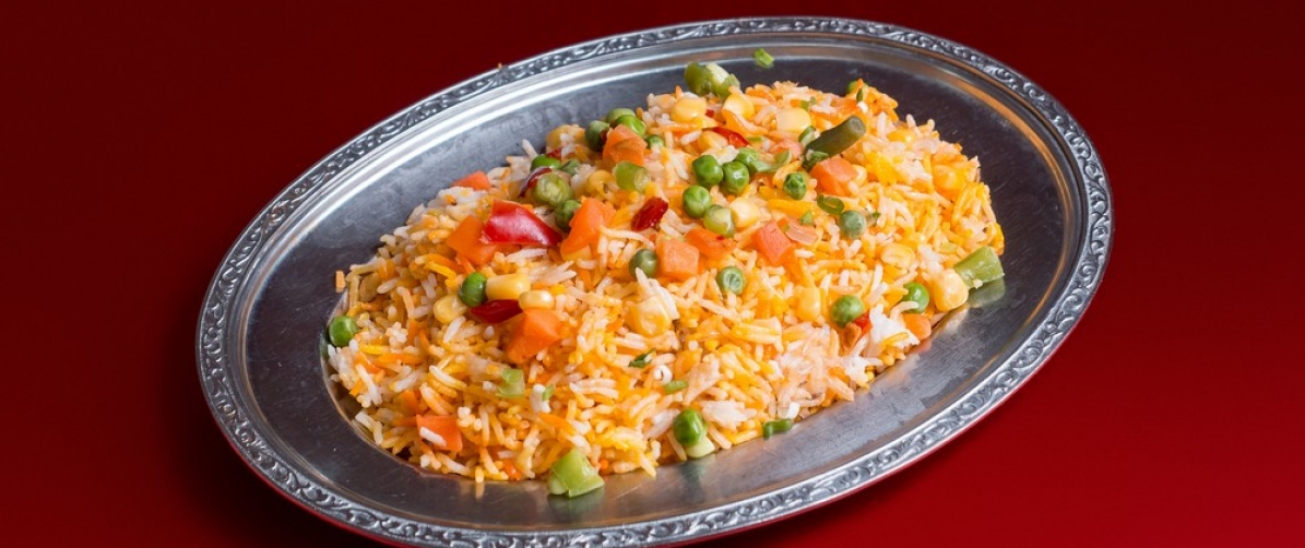Рис Басмати с овощами, приготовленный в кипящем масле с ароматными специями и травами.