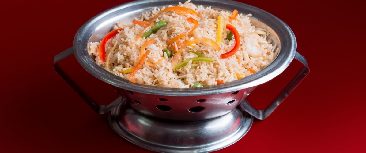 Басмати рис и овощи, обжаренные в кунжутном масле с добавлением соевого соуса.