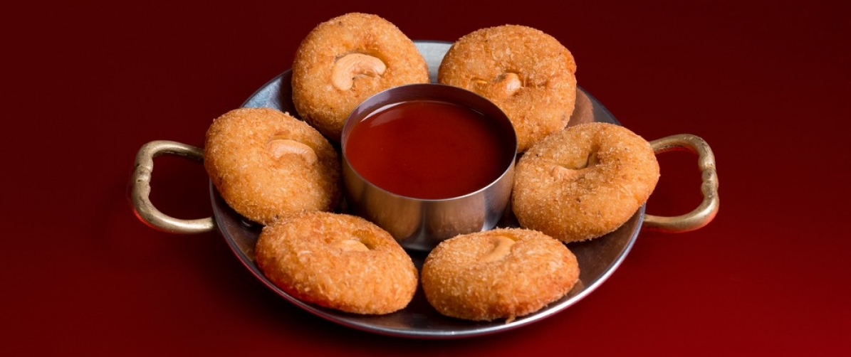 Медальоны из смеси картофеля, домашнего сыра и кешью, слегка обжаренные с мягкими специями.