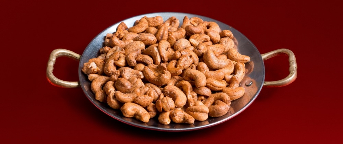 Fried cashewnuts served with red pepper, chat masala and salt. Nice combination with beer.