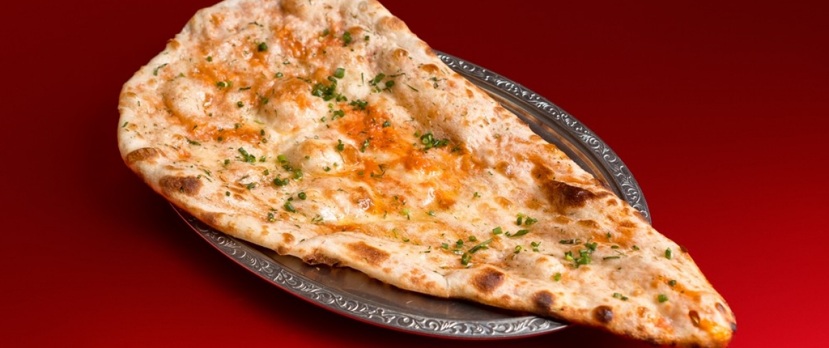 Tear drop shaped white bread stuffed with cheese and topped with chopped garlic cooked in tandoor.