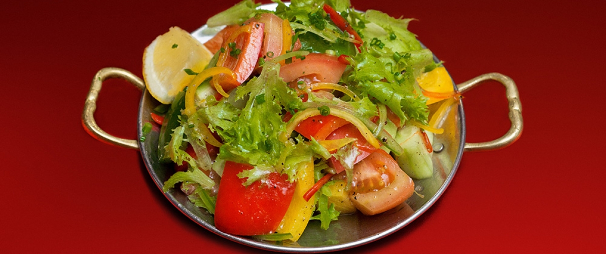 Свеженарезанные кубиками овощи (цветной сладкий перец, огурцы, помидоры, морковь)с зеленью и лимоном, заправленные оливковым маслом.