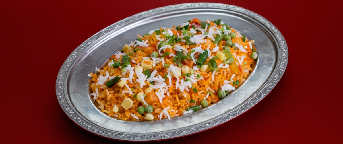 Рис Басмати, приготовленный с овощами с добавлением изюма и ароматных приправ. Украшается орехом кешью и яйцом. Подается с раитой.