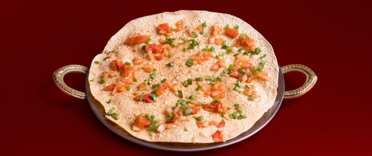 Тонкая хрустящая чечевичная лепешка, посыпанная нарезанными луком и помидорами со специальными специями.