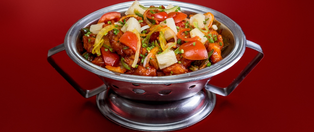 Обжаренные кусочки курицы в кисло-сладком соусе от шефа, с добавлением ананаса.