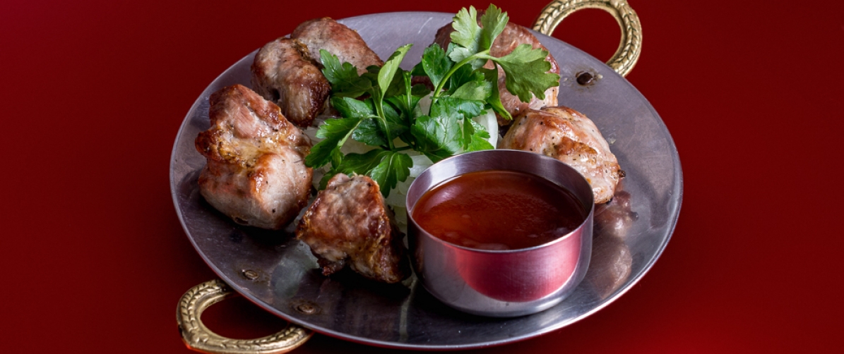 Кусочки свинины, маринованные с традиционной смесью специй и трав и обжаренные в глиняной печи.