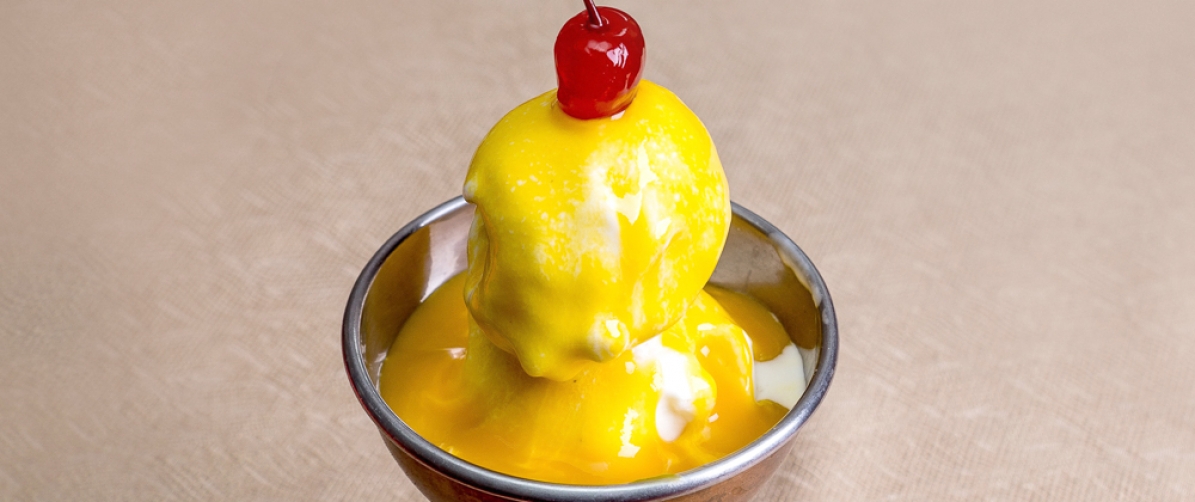 Сливочное мороженое с манговым сиропом.