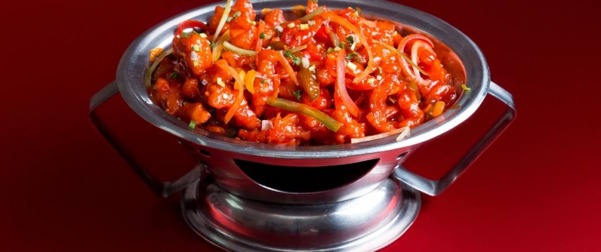 Chicken fingers dipped in gram flour batter, crispy fried with thick gravy made of Indian herbs and spices and garnished with diced red capsicum.