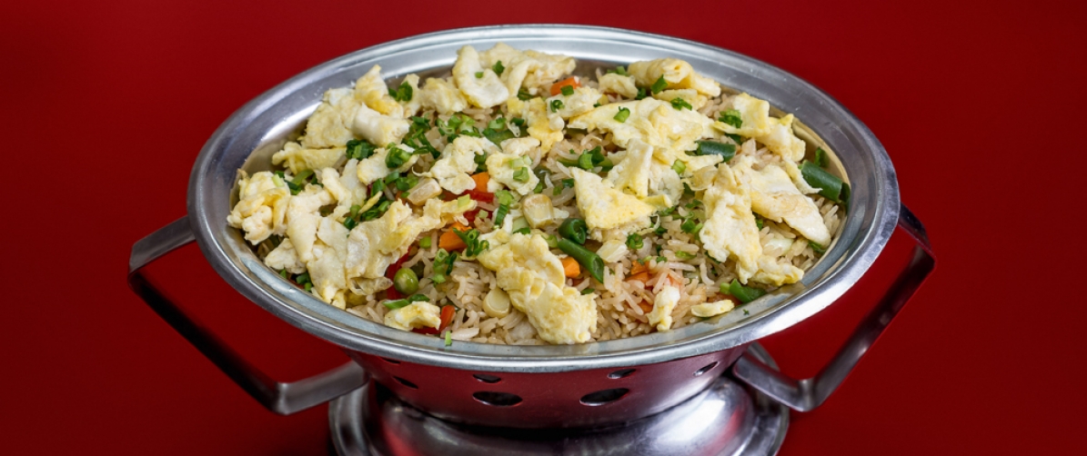 Basmati rice fried with eggs and soya sauce in sesame oil.