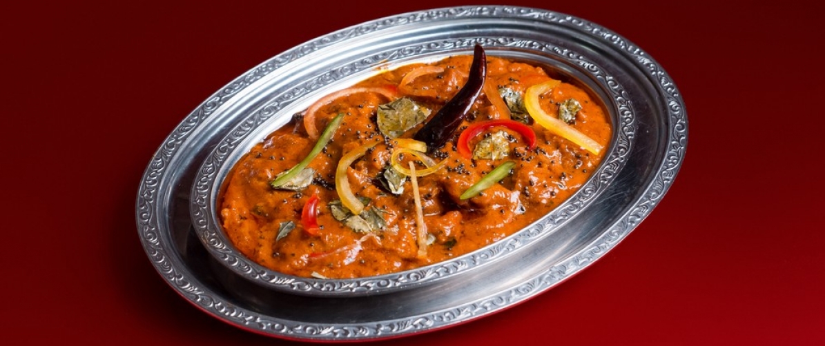 Cubes of pork cooked in thick onion-tomato sauce with mustard seeds, curry leaves and whole red pepper.